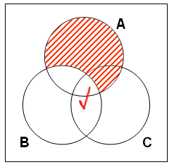 然而,從前提二,我們並無從確切得知這三種情況何者為真。為表示這處境,我們將在代表ABC及~ABC之區域之交界畫上剔號。見下圖: