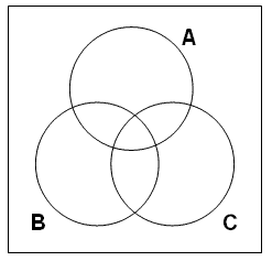 步驟一: 先畫三個相交的圓圈以代表代表例二提及的三個集合(以‘A’代表哲學家集,’B’代表聰明的東西集,‘C’代表科學家集),如下圖: