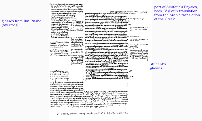 Here is a page from Henry of Renham’s copy-book. In the middle is the main text (part of book IV of Aristotle’s Physics translated into Latin from the Arabic translation from the Greek). The glosses on the left are from the commentary of ibn Rushd (known in medieval Latin as Averroes). The glosses between the lines and on the right are by Henry, who did this work by attending lectures in the Schools of Oxford. You can see that Irnerius’s glossing technology has developed. We are beginning to get manual precursors of today’s hyperlinks.